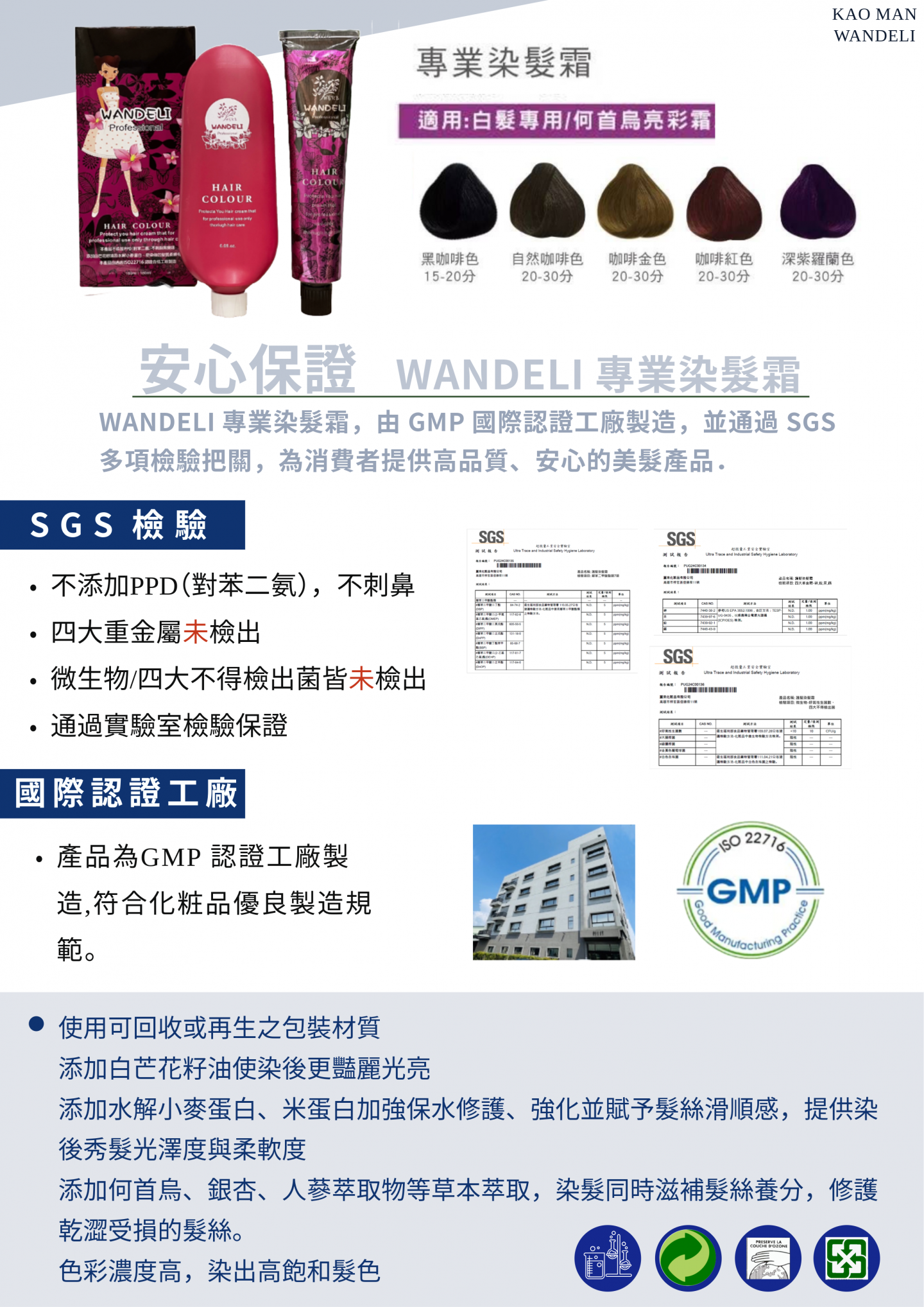 本產品不含(對苯二氨),不會造成頭皮刺激、紅腫,有效遮蓋白髮,使染髮髮絲柔順有光澤。
